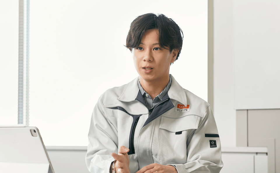 前職は人材広告会社で、電話アポイントや飛び込みといった、いわゆる「力技の営業」をしていました。そうした環境に身を置くうちに、お客さまから真に頼りにされる存在になりたいと思ったのが転職のきっかけです。お客さまと長期的な信頼関係を築ける営業の仕事はないかと探していたところ、LIXILリニューアルの「こうすれば良い工事ができますよ」という提案型の営業スタイルに惹かれ転職を決意。当初は営業職志望でしたが、面接時に社長から「1年間現場を見た方が強い営業職になれる」とアドバイスを受け、施工管理職からスタートしました。